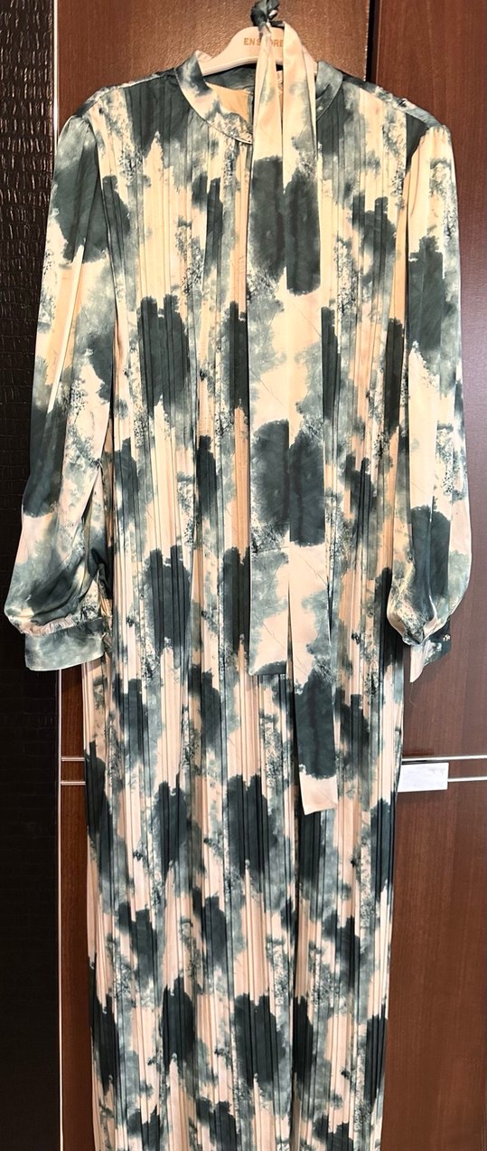 Uzun kollu, yüksek yakalı ve bol kesim elbise, sentetik kumaştan yapılmış, bej ve gri batik desenlidir. Pilili detaylara ve bohem stile sahiptir. 38 ile 42 beden arası uygundur