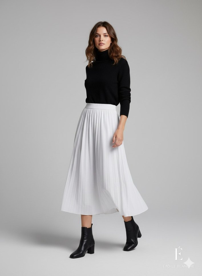 Pilili ve bol kesim beyaz midi etek, minimal ve gündelik stil için uygundur. Bel lastiği yıkamadan dolayı hasar almıştır ve iç gösterir.