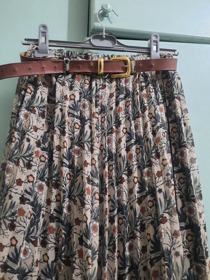 Pilili, bol kesim, koyu kahverengi batik desenli uzun kadın eteği. Yumuşak dokulu kumaştan, astarlı bohem tarzda günlük kullanım için uygun. kahve Kemer dahil değildir.