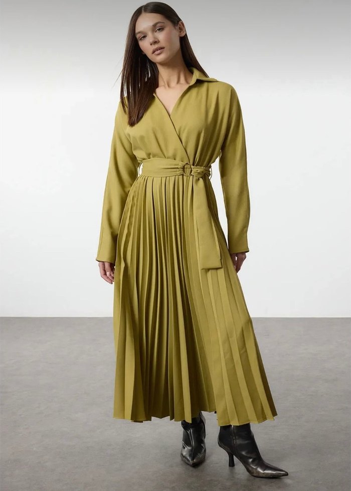 Khaki renkte, pilili, V yakalı ve uzun kollu bu uzun elbise, sentetik kumaştan üretilmiş olup, bol kesimdir. Ofis için uygun, minimalist ve çağdaş tarzda.