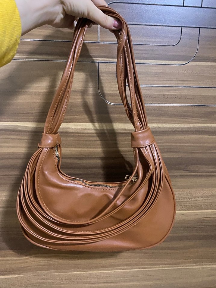 Kahve renk, pilise detaylı ve parlak görünümlü deri kadın çantası, çağdaş minimalist tarzda günlük kullanıma uygun. Hiç kullanılmadı