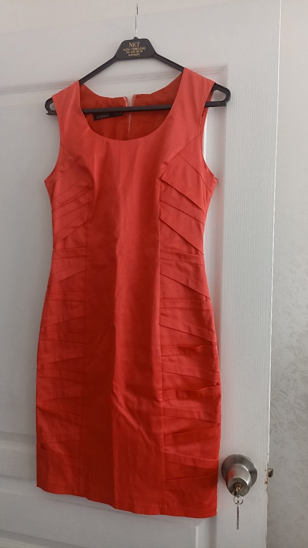 Kolsuz, pilise detaylı ve v yakalı ı midi elbise. Parlak dokusu ve minimal çağdaş tarzıyla ofis için uygundur.