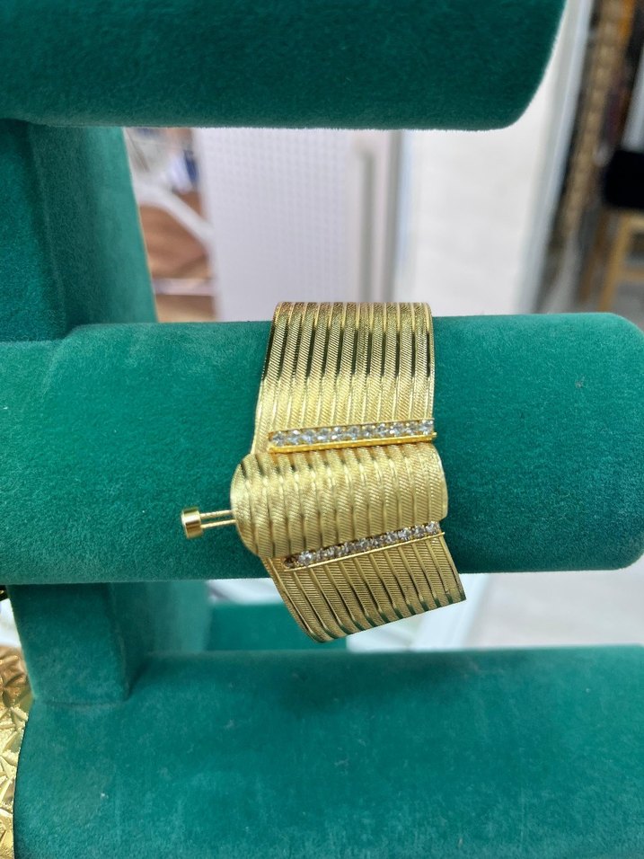 Piliselı dokulu, parlak altın renkli kadın bileklik. İnce taş detayları ve vintage tarzıyla düğünler için uygundur.