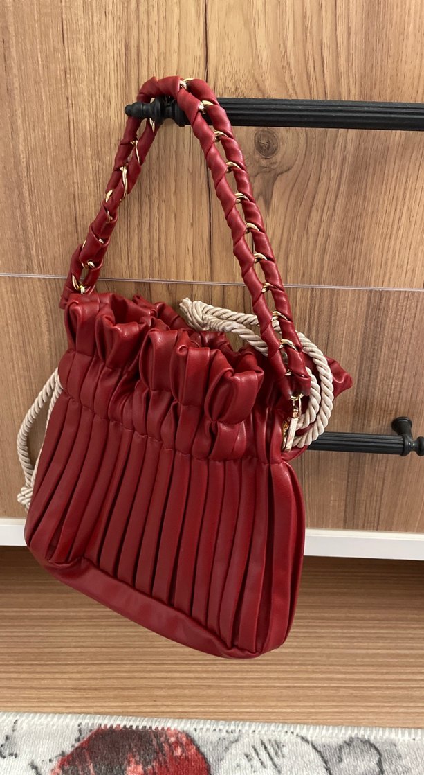 Kırmızı deri kadın çanta, pilise detaylı ve nakışlı desenlere sahip. Deri ve ipten örme kulplarıyla bohem tarzda, günlük kullanım için uygun.