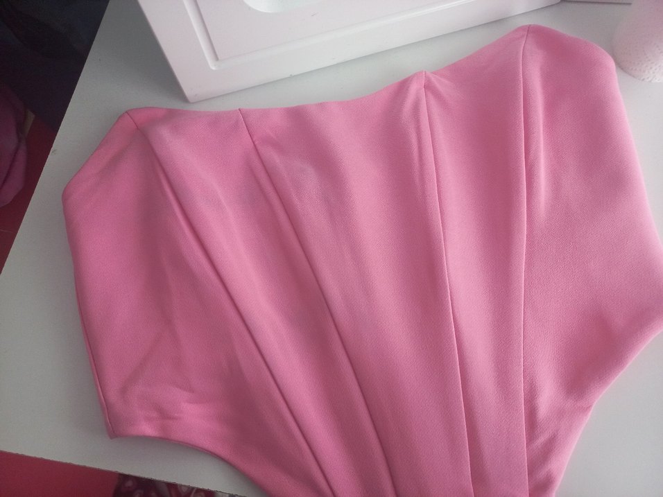 Pilili detaylara sahip, uzun boylu ve parlak pembe sentetik kumaştan yapılmış, çağdaş ve avangard tarzda krop