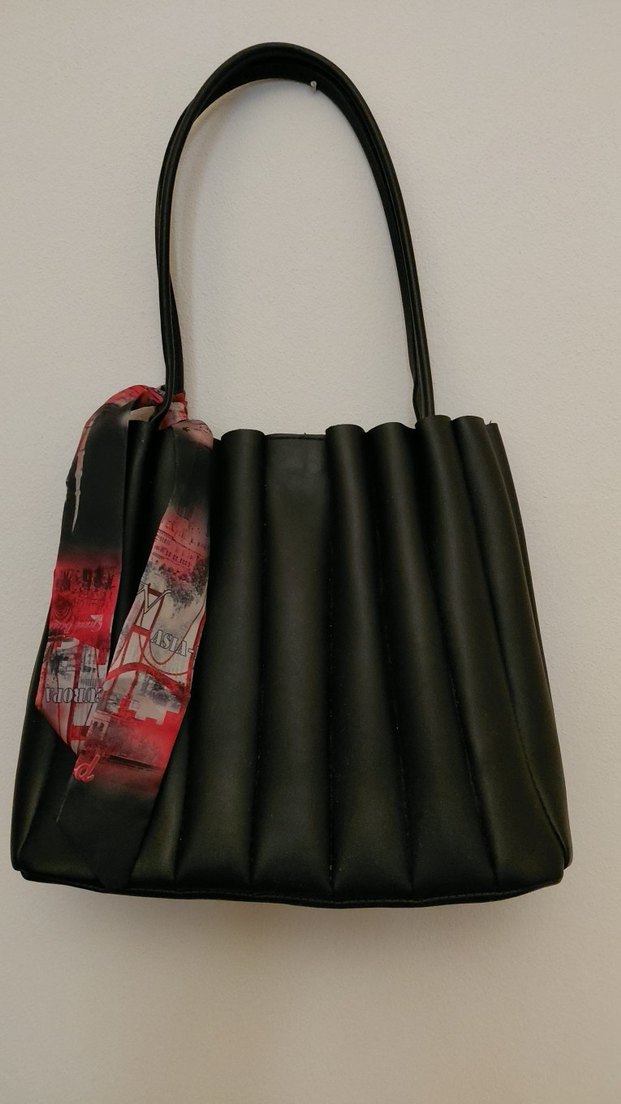 Siyah deri kadın çanta, pilise detaylı ve baskılı fular aksesuarına sahip. Günlük kullanıma uygun, gotik ve avangart tarzlara uyum sağlar.