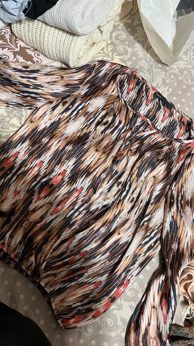 Uzun kollu, kayık yakalı ve bol kesim bohem tarzı bluz. Sentetik kumaştan, piliseli ve koyu çok renkli bağlamalı desenlidir. Günlük kullanım için uygundur.