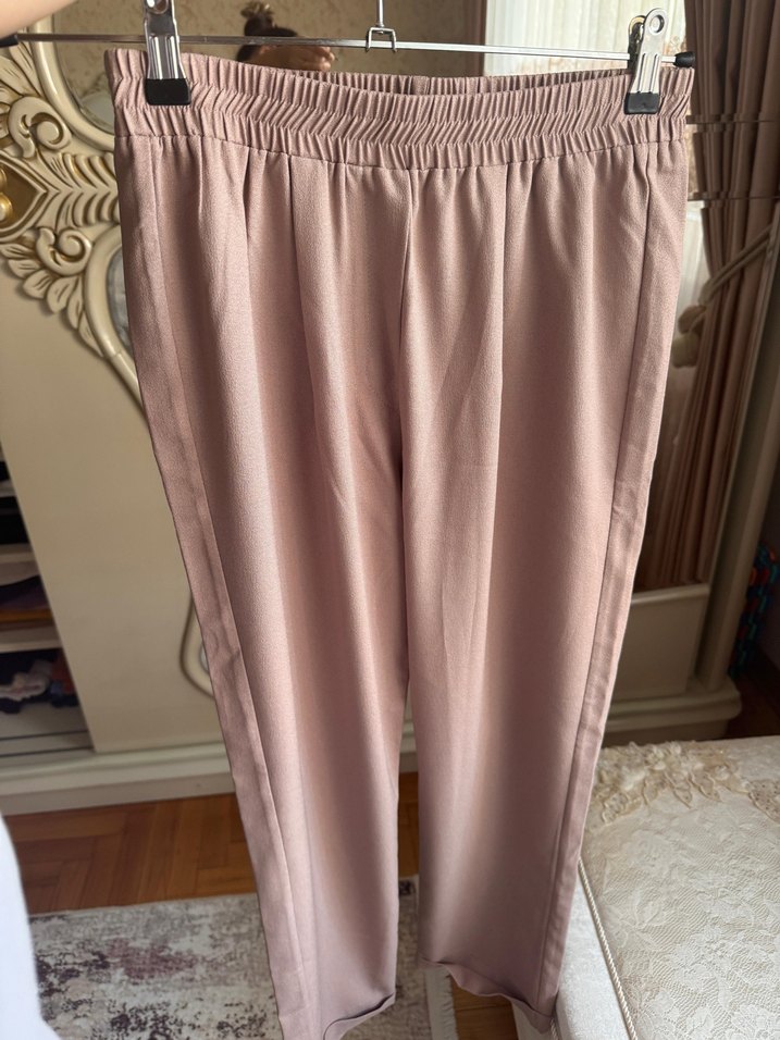 Piliseli detaylı, bej renkte, uzun ve rahat kesim kadın kumaş pantolon. Yumuşak ve parlak dokusuyla günlük kullanıma uygundur.