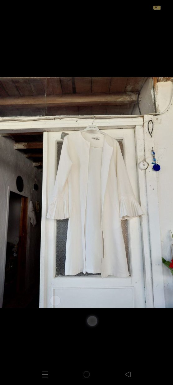 Beyaz uzun keten kaban, kol pilileri ve kesik yaka detaylarına sahiptir. Düzenli kesim ve çağdaş Paris tarzındadır. Günlük kullanım için uygundur.