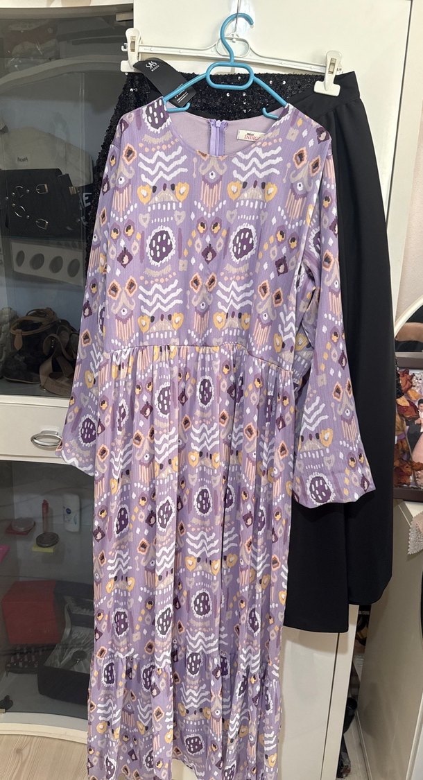Piliseli detaylı, bol kesim uzun mor elbise. Uzun kollu ve yuvarlak yakalı, yumuşak sentetik kumaştan üretilmiştir. Bohem tarzı için uygundur.