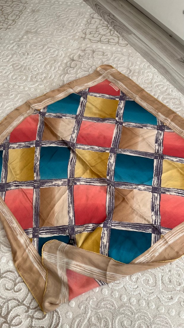 Kadın eşarp, piliseli tasarımı ve çok renkli kare desenleriyle bohem vintage tarzını yansıtıyor. Hafif ve yumuşak sentetik kumaştan üretilmiştir.