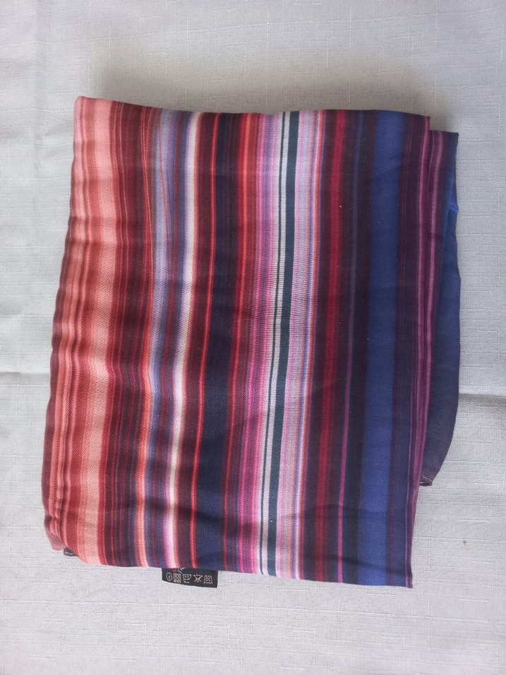 Kadın şal, piliseli detaylara ve koyu çok renkli çizgili desene sahiptir. Yumuşak sentetik kumaştan üretilmiştir, bohem ve retro tarzlara uygundur.
