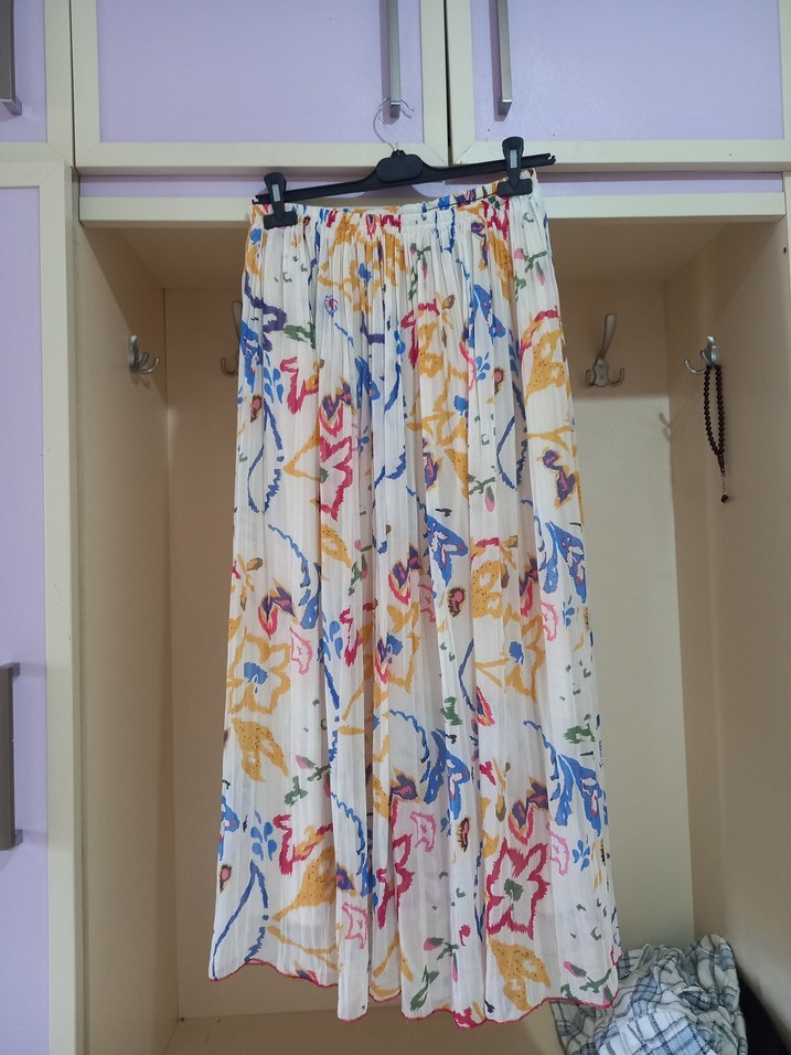 Piliseli detaylara sahip, bol kesim uzun etek. Hafif kumaştan yapılmış, çok renkli batik desenli bohem tarzda, günlük kullanım için uygundur.