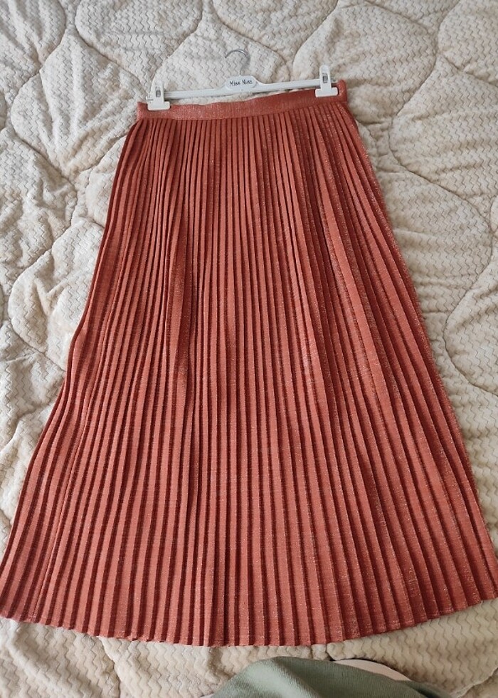 Piliseli ve parıltılı bir kumaşı var. Sadece iki kez giyildi. Kumaşı asla kırışmıyor. Kiremit rengi. Özel günlerde kullanılacak şık bir parça. Ben, üzerine şık bir ceketle abimin nişanında giymiştim.