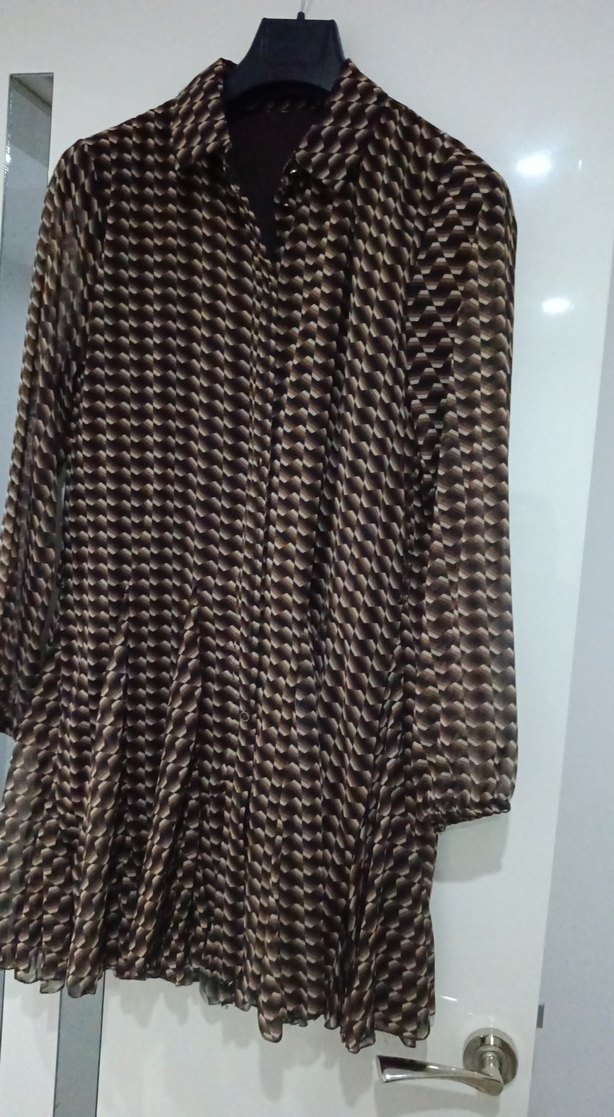 Kahverengi piliseli şifon elbise uzun kollu ve yüksek yaka detaylıdır. Sentetik kumaştan üretilmiş, bol kesim ve midi boyda, günlük kullanım için uygundur.