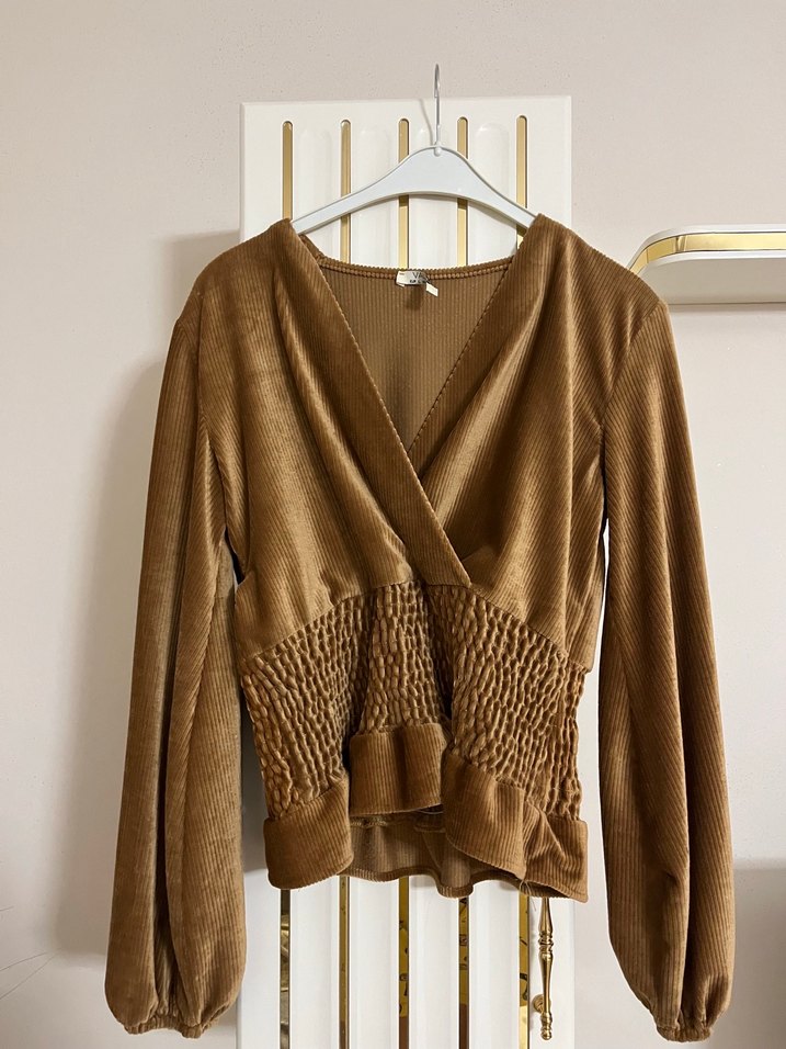 Kahverengi süet kumaştan, V yakalı ve uzun kollu, piliseli bel detayıyla kısa kesim, şık ve rahat bir bluz. Gerçekten kışın güzel bir yere gidildiği zaman çok tatlı olur ben kıyafetleri çok az kullan kullanabildim bazı süreçlerden dolayı çok çok az kullanmışımdır belki iki en fazla