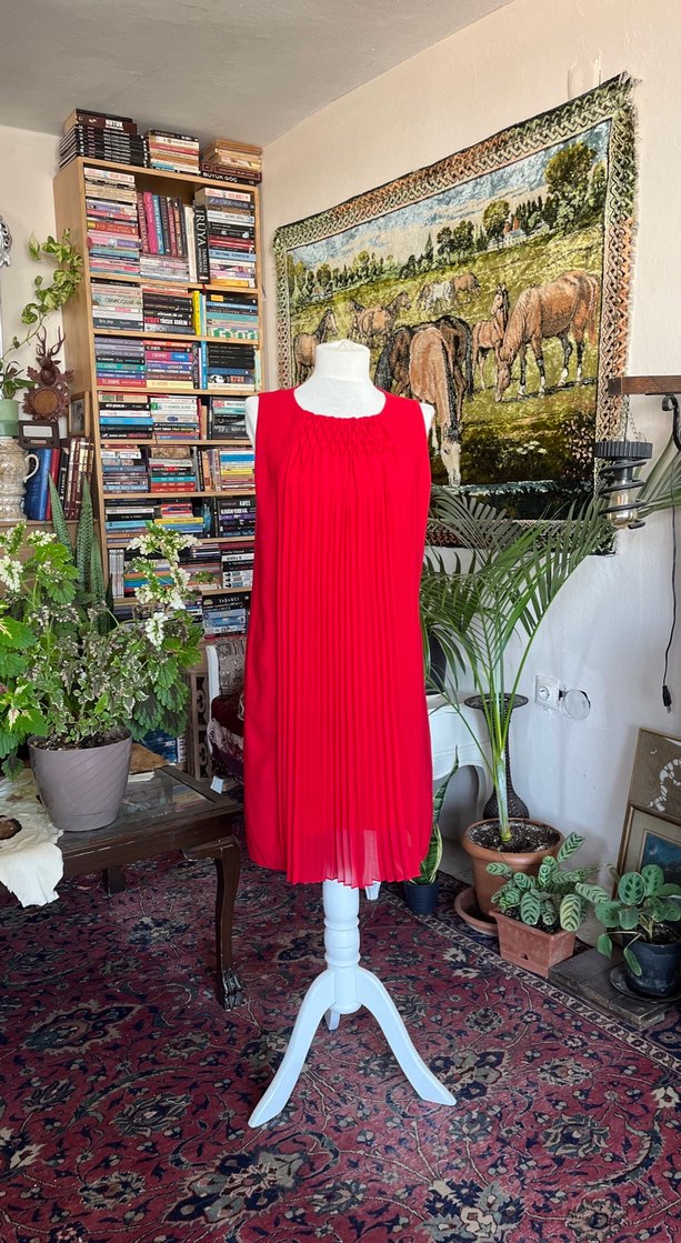 Kırmızı, kolsuz, piliseli midi elbise, yüksek yakalı ve bol kesimdir. Bohem tarzıyla romantik akşamlar için uygundur. ❤️ YAKASINDA MİNİK BİR LEKE VAR , YIKAMADIM, YIKAYINCA GEÇEBİLİR, YIKIYIP GÖNDERECEĞİM, BİLEREK ALIM YAPIN LÜTFEN