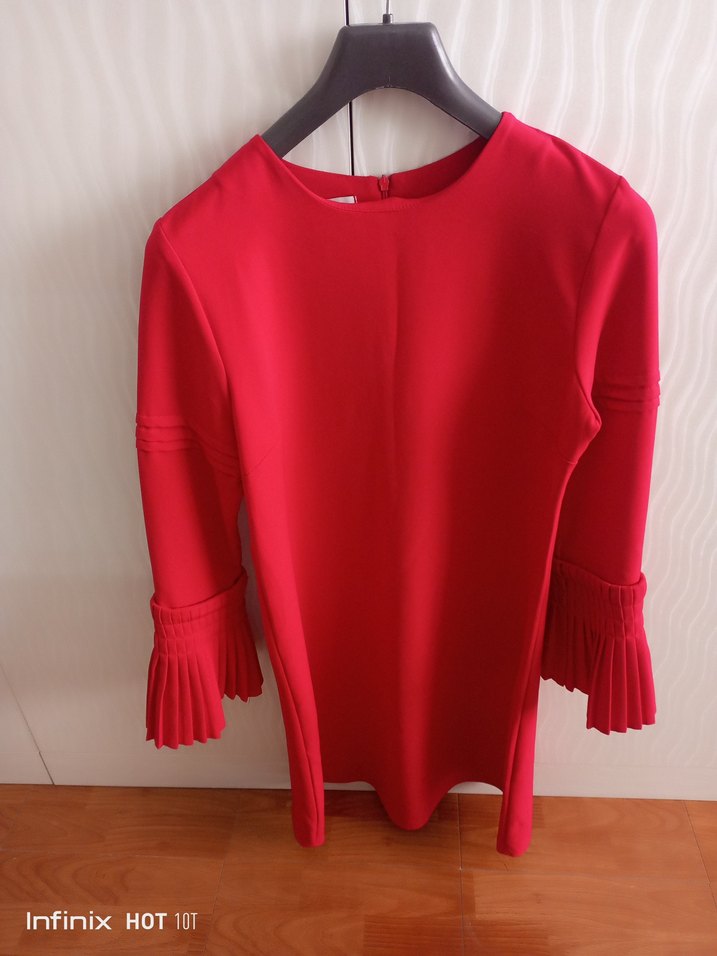 Bu kırmızı tunik, piliseli uzun kollara ve yuvarlak yakaya sahip, vücuda oturan kesimiyle midi boyda ve sentetik kumaştan üretilmiştir. Minimalist ve çağdaş tarz için uygun.