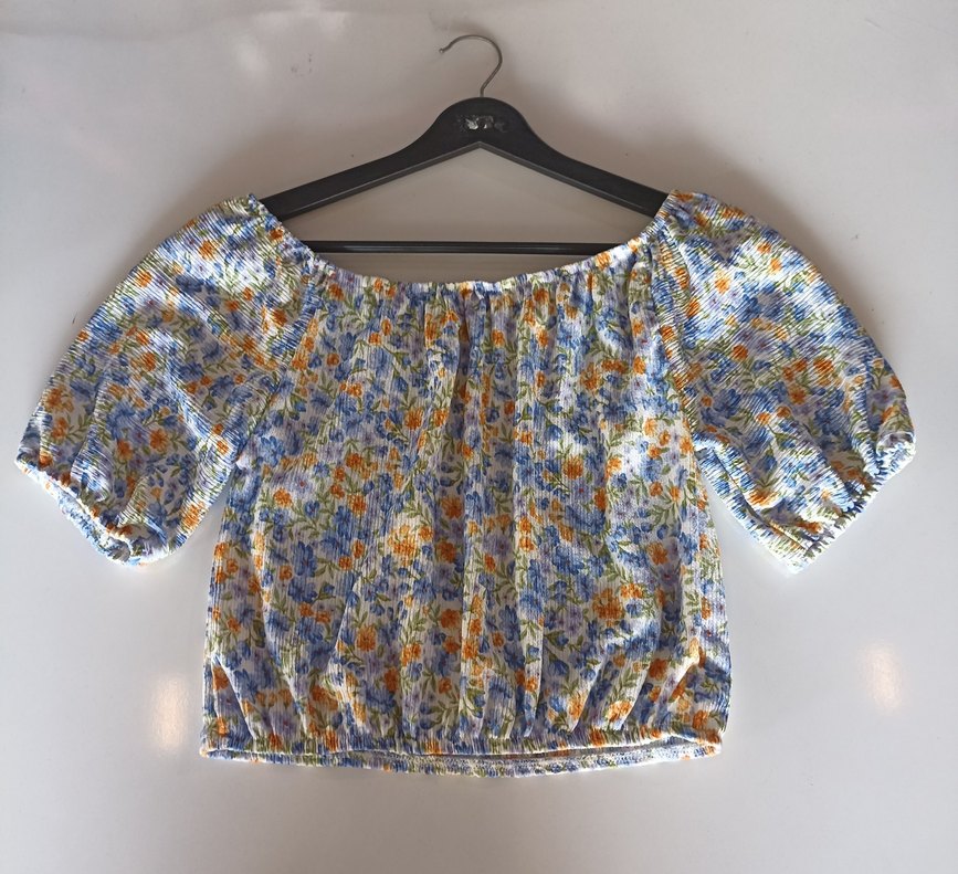 Kadınlar için kayık yaka, kısa kollu, piliseli ve bol kesimli bluz. Pastel çok renkli batik desenli, yumuşak sentetik kumaştan, günlük sokak stili için uygun.