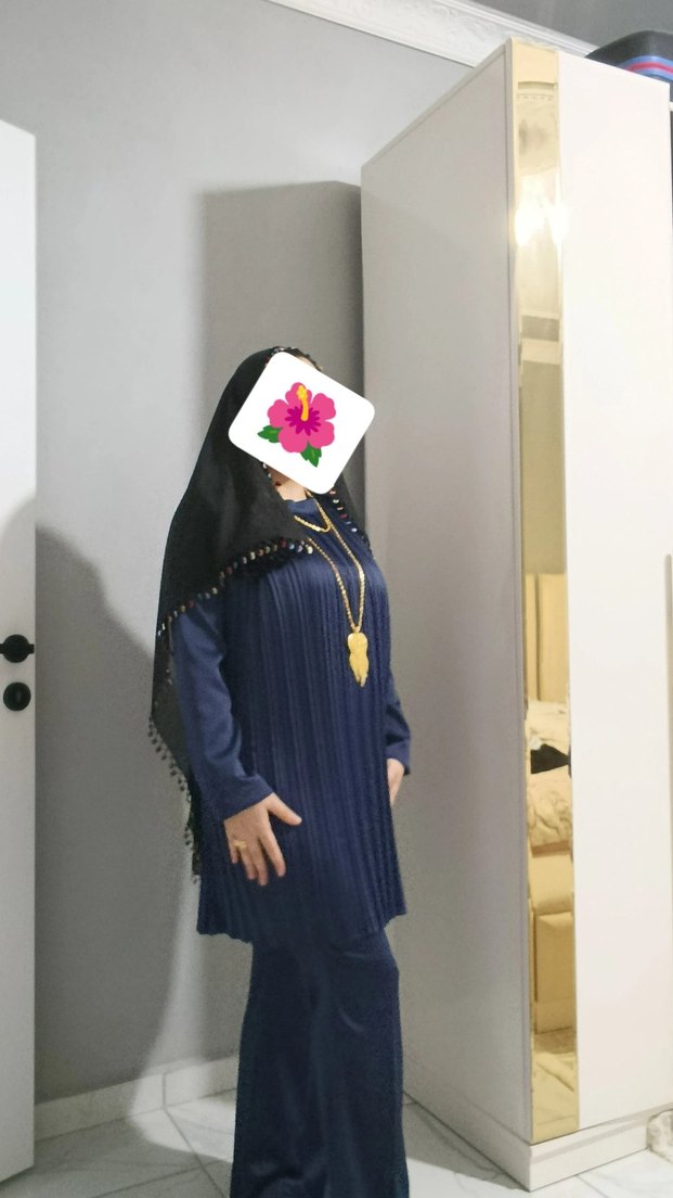 Lacivert takim, yüksek yakalı ve uzun kollu, bol kesimdir. Sentetik kumaştan yapılmış, etnik desenli ve piliselidir.