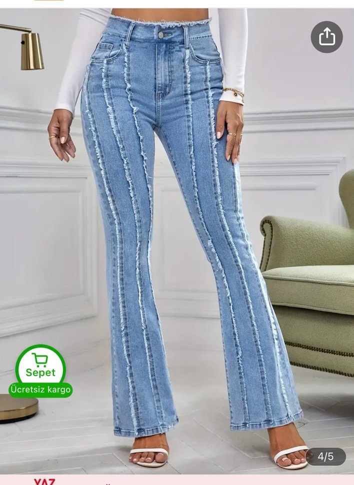 Piliseli detaylara ve pastel tonlarda batik desenine sahip ispanyol kesim mavi kot pantolon.Uzun boy boh tarzda, günlük kullanım için uygun.