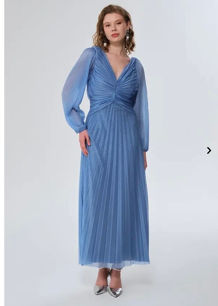 Gusto piliseli mavi elbise bir kere giyildi deformesi yok 165 boy 83 kg da duruşu fotoğraftaki gibi