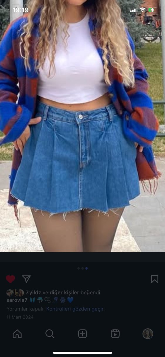 Bol kesim, piliseli kısa mavi denim mini etek. Günlük sokak tarzı için uygun, hafif tie-dye desenli.