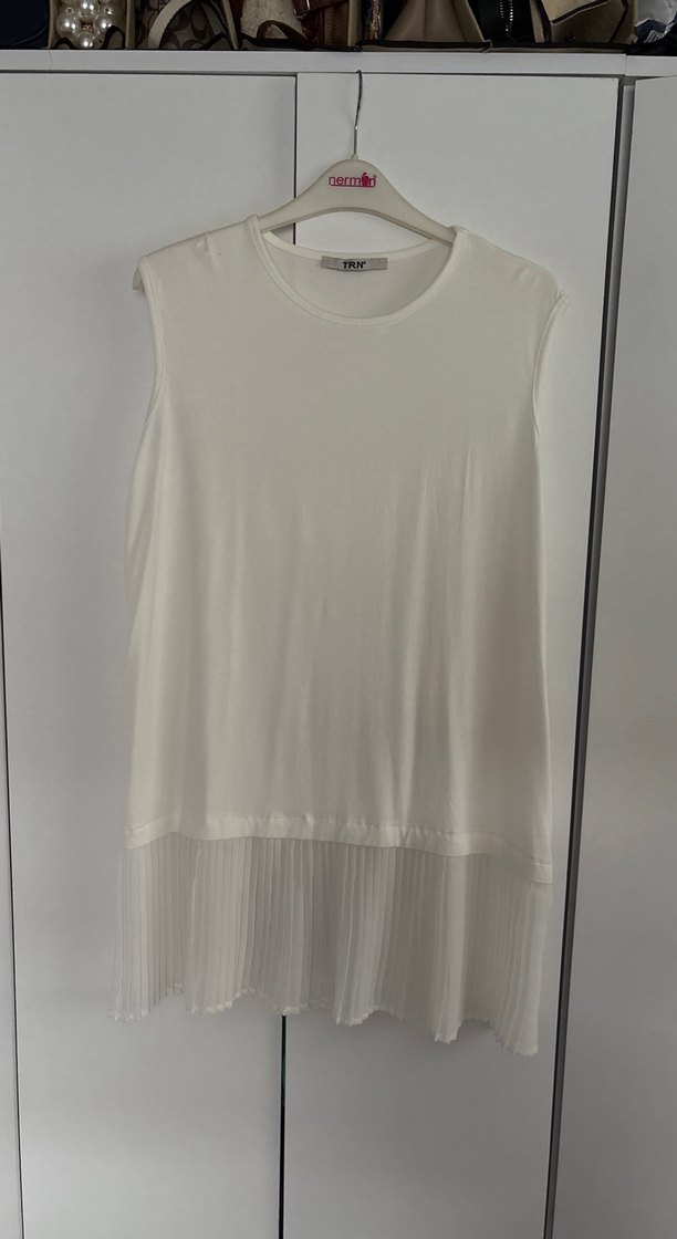 Kolsuz, bisiklet yaka beyaz tunik, piliseli midi boy etek ucu ve bol kesimlidir. Yumuşak sentetik kumaştan yapılmıştır, günlük kullanım için uygundur.