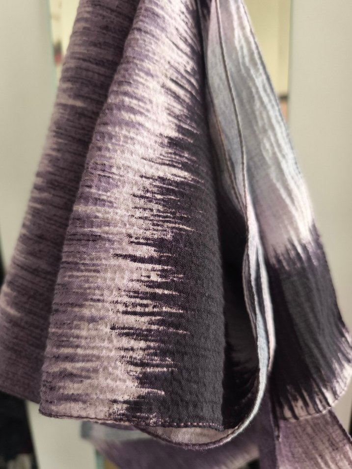 Mor ve gri tonlarında piliseli sentetik kumaştan yapılmış kadın şalı, çağdaş ve rahat bir tarz sunar.