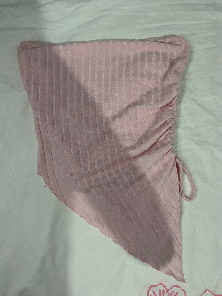Yumuşak keten kumaştan yapılmış, piliseli detaylara sahip pastel pembe kadın crop, rahat ve bohem tarzda.