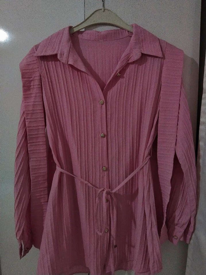 Pudra pembe renkli, ince dokulu ve piliseli kumaşa sahip tunik/elbise. Önden düğmeli, gömlek yaka ve uzun kolludur. Bel kısmında bağcık detayı bulunur, isteğe göre ayarlanabilir. Rahat kalıplı olup dökümlü bir duruşa sahiptir. Günlük kullanımda ya da şık kombinlerde rahatlıkla tercih edilebilir. ✔️ Hiç giyilmedi sadece etiketi çıktı