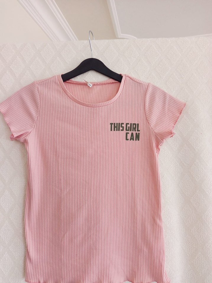 Kısa kollu, yuvarlak yaka, piliseli dokulu pembe kız çocuk tişörtü. Üzerinde 'THIS GIRL CAN' yazısı bulunur. Trend sokak stili için uygundur.