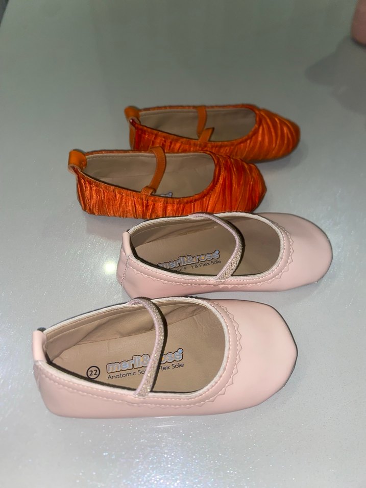 piliseli detaylı 2 adet kız çocuk babet ayakkabılar.rahat kauçuk tabanlıdır. Merli&Rose marka 22 numara, ikiside çok şık.