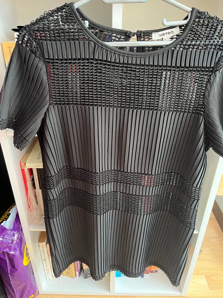 Kısa kollu, yuvarlak yakalı, piliseli detaylara sahip siyah bluz Gotik Paris tarzında, ofis kullanımı için uygun.
