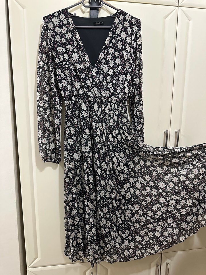 Siyah çiçekli midi elbise, piliseli tasarımı, uzun kollu ve V yakalı, bol kesim bohem tarzda.
