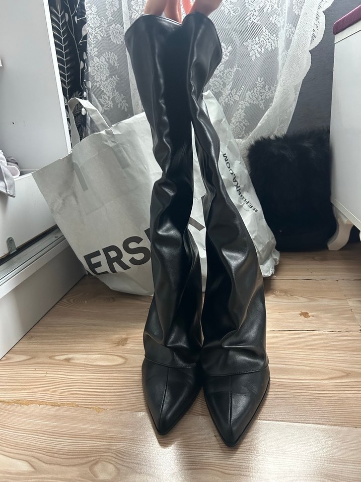 Sivri burunlu, piliseli detaylı siyah deri cizme topuk boyu 8,5
