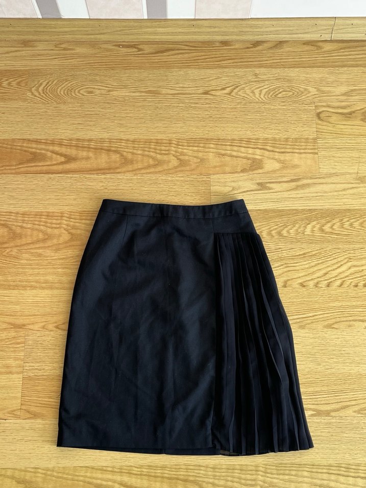Siyah midi eteği, sentetik kumaştan, normal kesim ve tek yanda piliseli detaylı. Ofis kullanımı için uygundur.