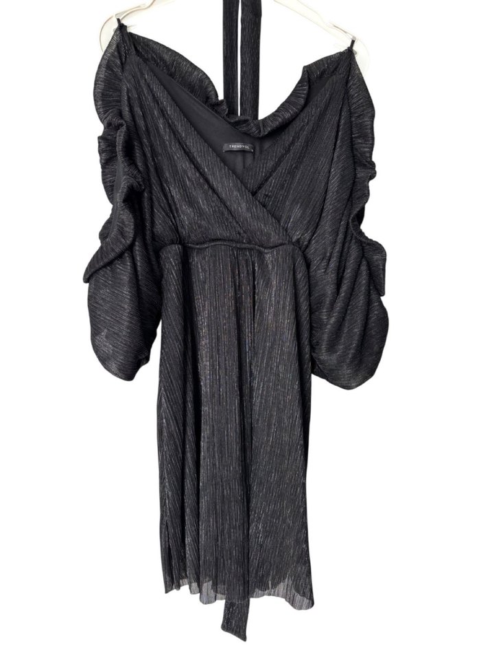 Piliseli kumaştan yapılmış, bol kesimli siyah abiye elbise. Gotik tarzı modern bir dokunuşla birleştirir, şık süs kemeri var
