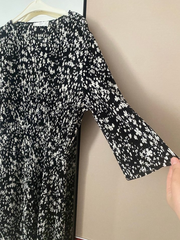 Uzun kollu, V yakalı, piliseli detaylı, siyah beyaz elbise Günlük kullanıma uygundur.