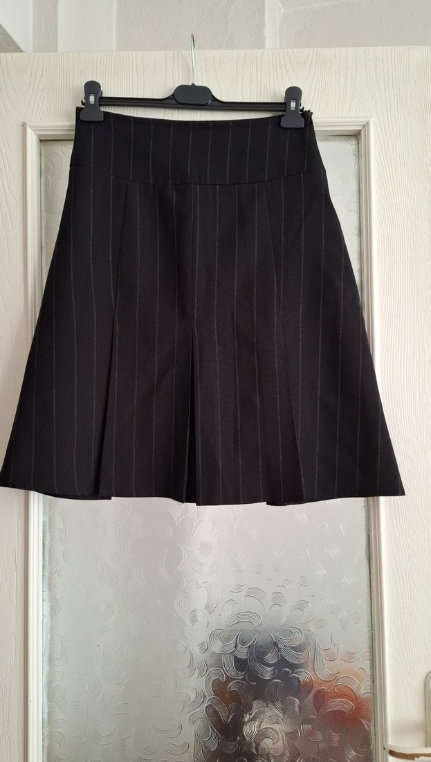 Piliseli, çizgili desene sahip siyah hamile eteği, midi boy ve regular fit kesimdir. İş ortamına uygun klasik zarafet sunar. Çok iyi durumda 36 beden.