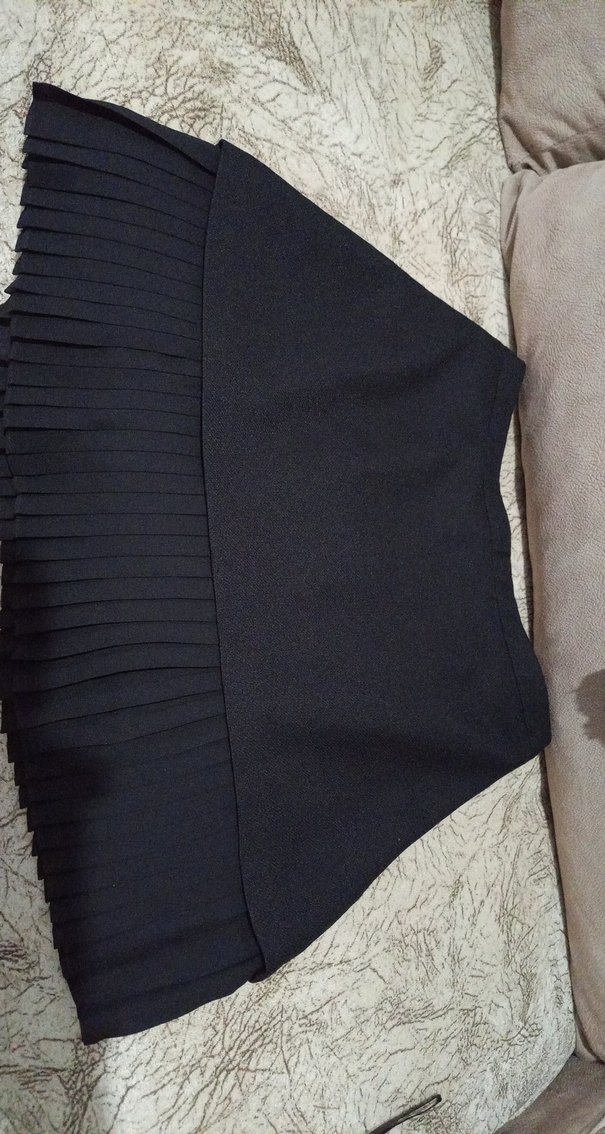 Bu siyah mini etek, piliseli detaylarıyla ve vücuda oturan kesimiyle dikkat çeker. Sentetik yumuşak kumaştan yapılmıştır, gotik tarz için uygundur. uzunluğu 47 cm