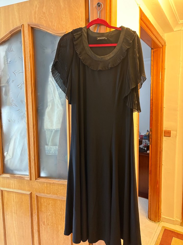 Piliseli yuvarlak yaka ve kısa kollu, bol kesim siyah uzun elbise, klasik gotik şıklığını ofis ortamına taşır.