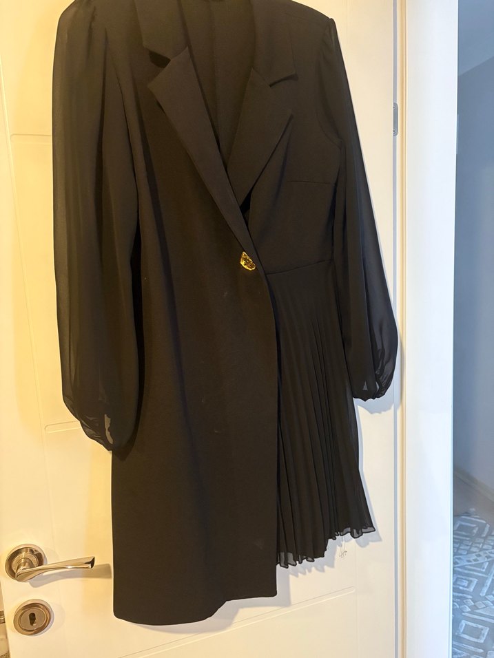 Notched lapel yakalı, tek tarafı piliseli, uzun kollu siyah kadın elbise. Ofis kullanımı için uygun, regular fit.