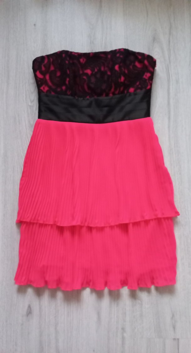 Piliseli etek ve straplez yaka detaylı, 38 yazıyor ama 36 bedene rahat olur. saten bel kısmı 35 cm. vücuda oturan midi uzunlukta pembe abiye elbise, cesur ve avangart parti tarzına uygundur.
