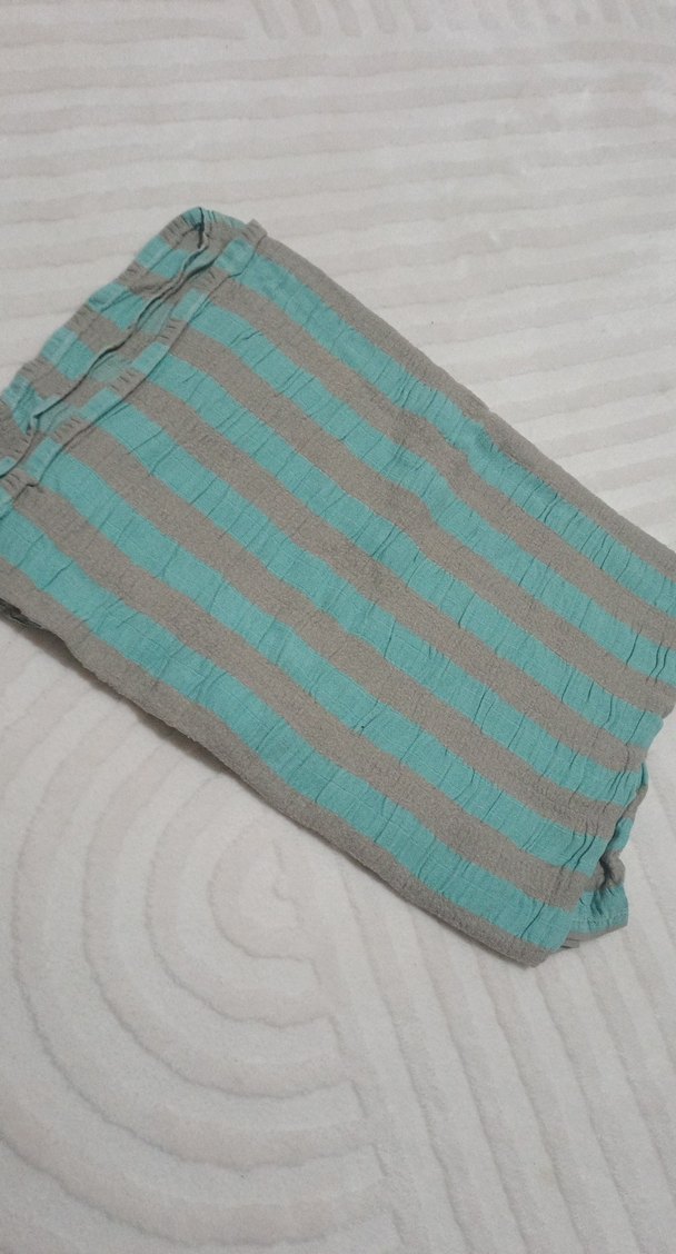 Turkuaz ve gri çizgili, yumuşak keten kumaştan yapılmış piliseli kadın şalı. Rahat ve bohem tarzlara uygundur.