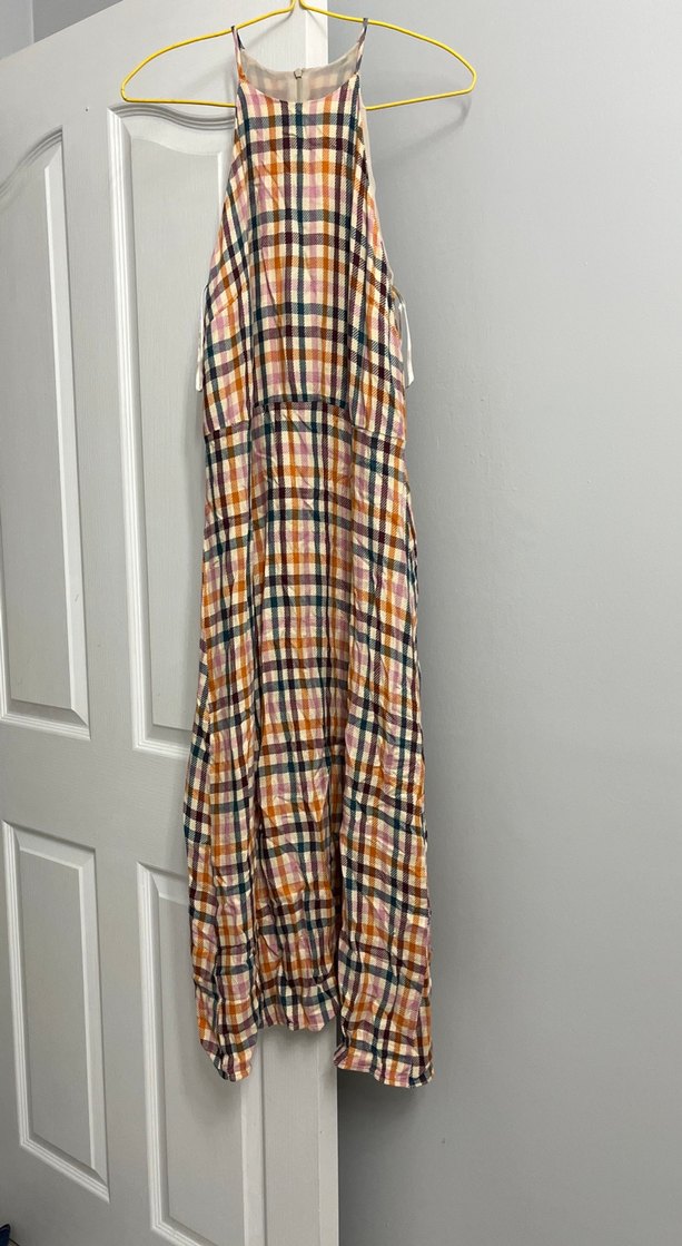Yüksek yakalı, askılı, bol kesim, piliseli uzun kadın elbisesi. Sentetik kumaştan, çok renkli kareli desene sahip, bohem tarzına uygun.