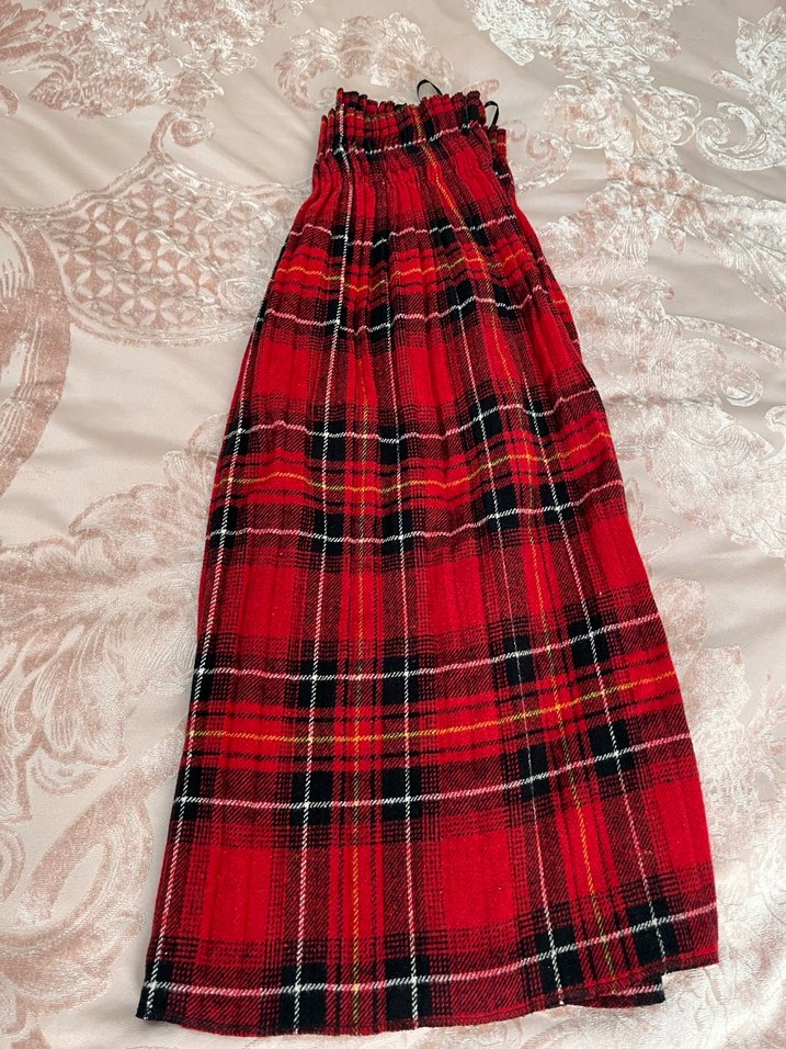Piliseli Uzun Kırmızı Ekose Etek kışlık etek