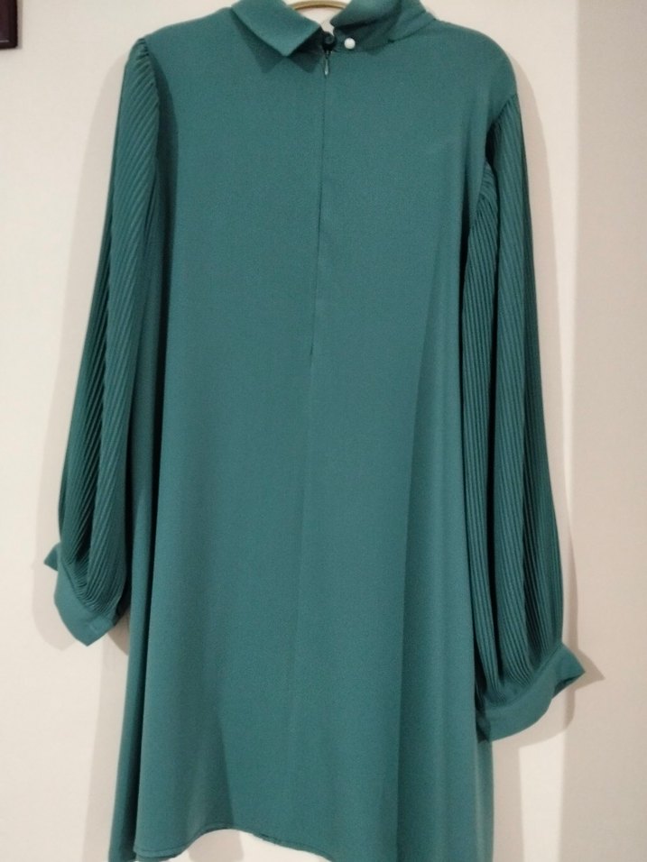 Sentetik kumaştan, piliseli uzun kollu ve yüksek yakalı, bol kesim uzun turkuaz tunik. Ofis kullanımı için uygun.