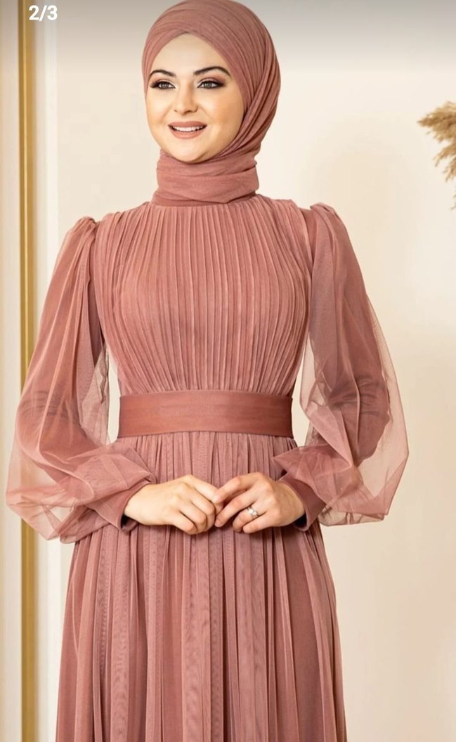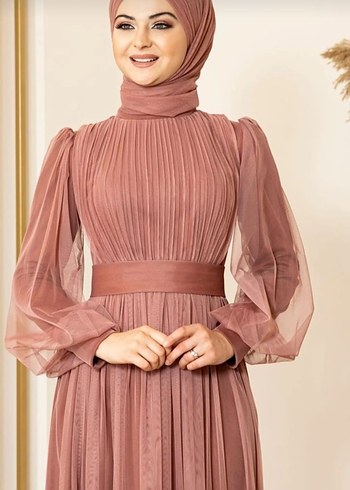 Piliseli detaylı, uzun kollu ve yüksek yakalı, pastel bej tonunda, klasik modern kesime sahip, vücuda oturan uzun abiye elbise.