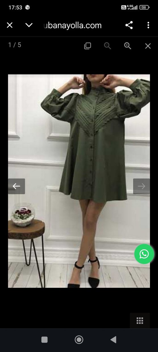 Yüksek yakalı, piliseli detaylı, uzun kollu ve bol kesim haki elbise, çağdaş bir tarz sunar.